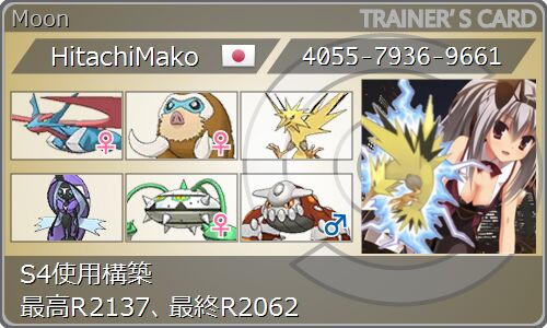 みなさんこんにちは、いっちーです。 シーズン4で使用した構築の紹介をしたいと思います。 BOSS RUSH付近から使用し始め(その時はヒードランがポリゴン2、ボーマンダの型が両刀だった)、間が空いたときもありましたが BOSSRUSH:11-10(最終R1510) SD瞬間1…